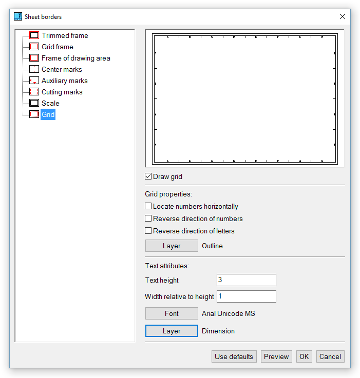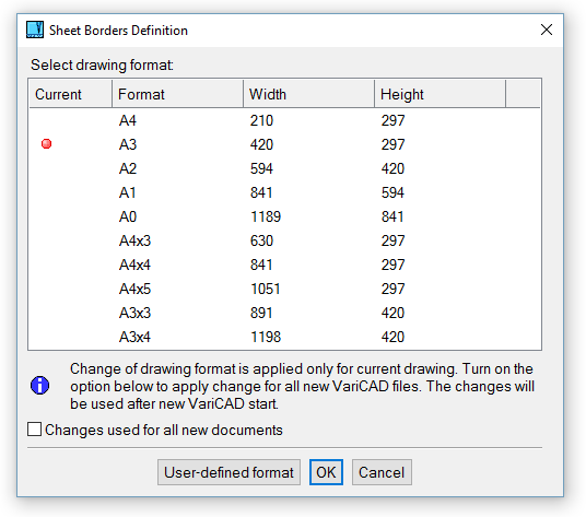 System draws a rectangle around the current sheet border, regarding the current drawing scale. The rectangle is drawn in the same style as an auxiliary grid. This format border is not printed and cannot be detected, it is only displayed. Contrary to the format border in the drawing background, you can insert a border created in a configured style from detectable and printable 2D lines. Such a border is a part of the current 2D drawing.