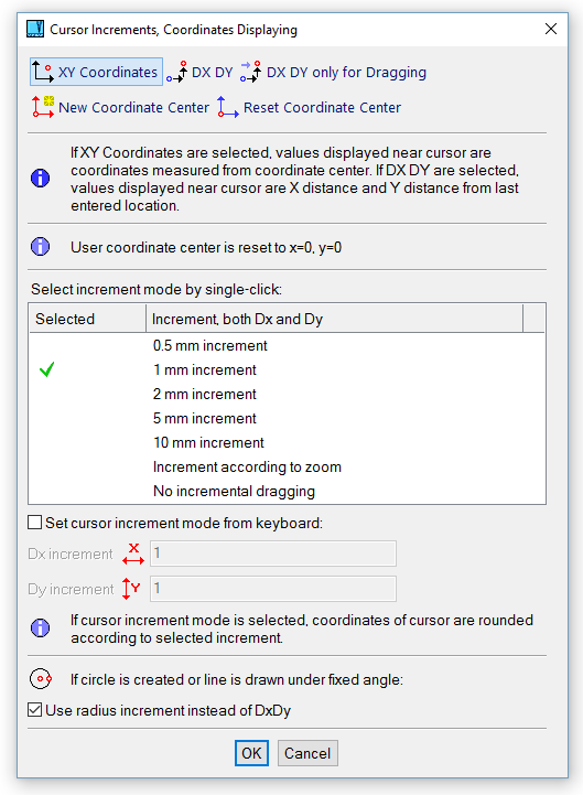 When not in Increment mode, the cursor moves smoothly and defined locations are based on display resolution. When using Increment mode, cursor locations are rounded to the nearest multiple of the increment distance. The square or arrow cursor movements are still smooth; only the resulting locations are rounded. Crosshair cursor movements “jump” in the defined steps. Increment mode is indicated in the Status Bar. Increment mode is especially useful when used in conjunction with a user-defined origin.