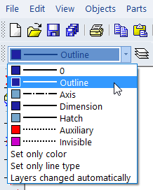 You can define up to 250 layers in each file. Each file contains one predefined layer named “0.” In 2D assembly, layers can be used to distinguish between separate details. For detail views or 3D view exports, layers should be used for distinguishing outlines, axes, dimensions, hatches etc.