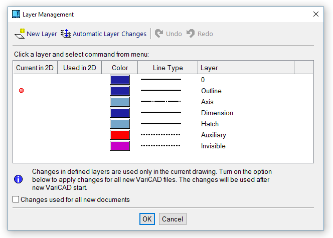 Automatic layer switching can be set from the command CFG or LAY (see above). Automatic layer switching is useful for drawing 2D details. Layers are switched according to the executed function. Drawing functions like Line or Arc tools create objects automatically placed in Layer “outline.” Hatches are placed in “hatches;” dimensions are placed in “dimension.”