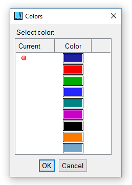 For 2D objects, there are nine colors you can use. For 3D objects, there are 32 colors. Following dialog window contains list of colors available for 2D objects. The displayed color set is used for light background.