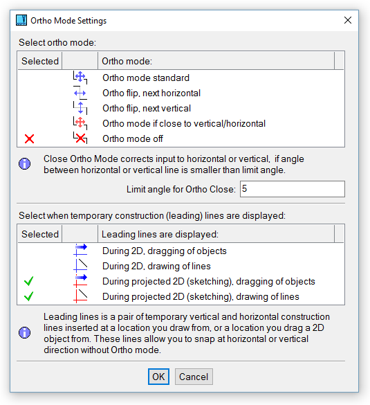 Ortho mode is used, if the angle of the current cursor location measured from the last input is close to horizontal or vertical direction. The angular limit can be set.