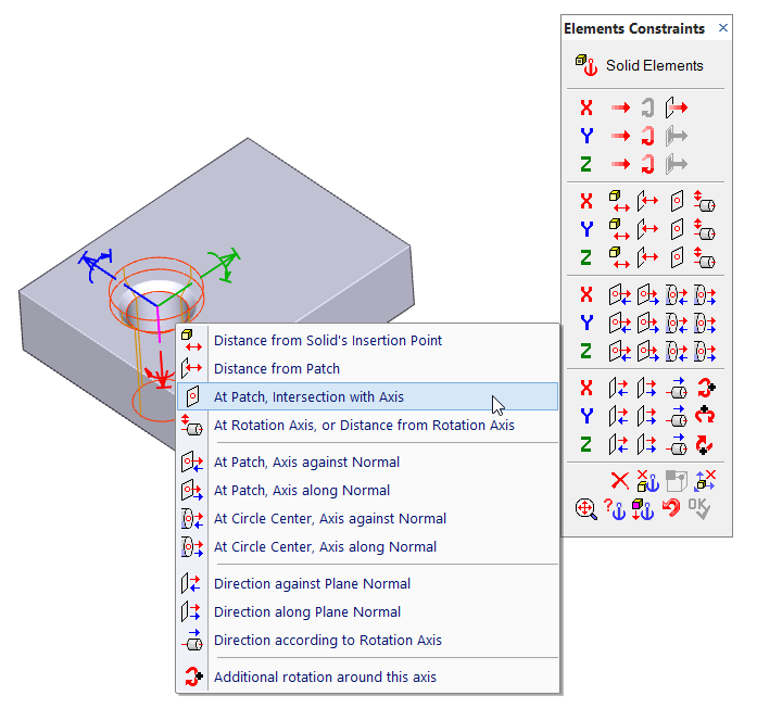 Geometric constraints can be defined among solid elements inside a Boolean tree, or among entire solids in 3D space.