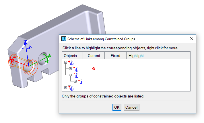 If you want to select anchors (or master solids, or solids the group is constrained to), click a corresponding column in the scheme. Then you can highlight each constraint individually – again because you will see which object will be selected. Or you can select the anchor of each constraint.