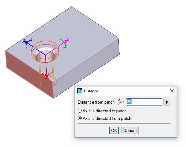 | Distance from a patch, the axis is not directed. Intersection between the axis and the selected patch is calculated. The constrained object is fixed at a specified distance from the intersection. |
