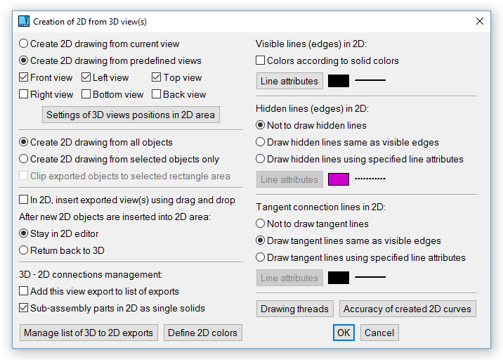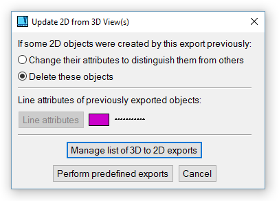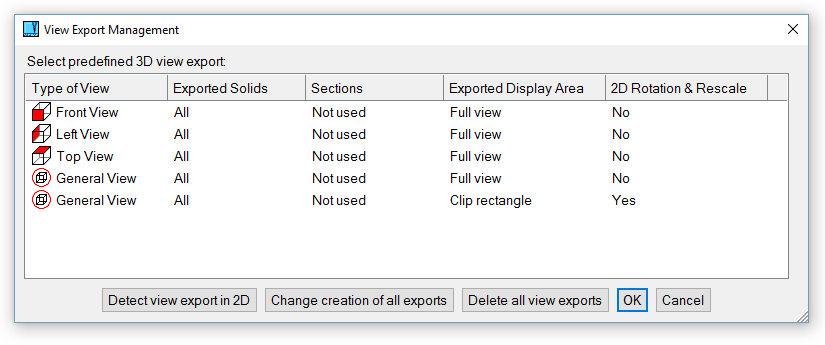 Manages a list of predefined view exports. This function is available also from Update 2D after 3D Changes or from Creating 2D from 3D. The view export can be selected from the list as well as from corresponding 2D objects. You can: