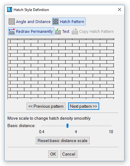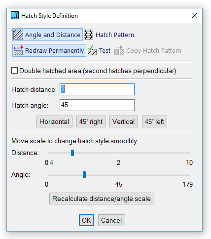 You can choose between single hatching and a hatch pattern. If the single hatching is selected, an angle and a hatch distance are defined. In both cases, you can move the slider in hatch style window to change the hatch density continuously. Click button “Recalculate angle/distance scale” to change the hatch density slider margins.
