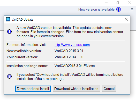During start, VariCAD checks our server for available updates. If the system detects that you run older version, a message is displayed at the upper right corner of the VariCAD window. Click it, and you can install a new version.
