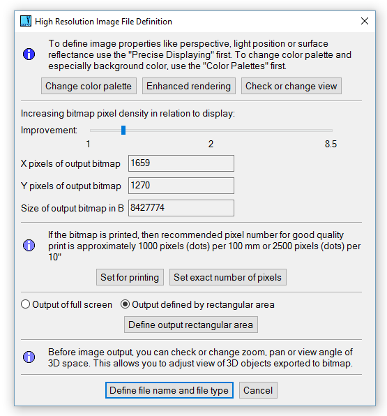 Before the bitmap image is created, you can check objects displayed inside the output area (full screen or defined rectangle). The display can be finally changed by standard functions like zoom, pan or view angle. If you need to change displaying from standard to enhanced (allowing perspective, light position changes etc.) or if you need to change the color palette, perform these changes before the bitmap output function is called.