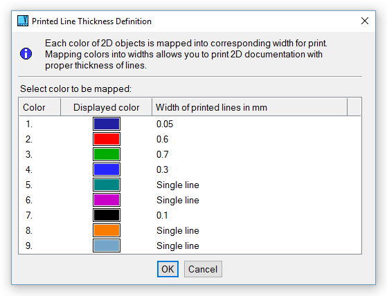 When using a color printer, you can map the display colors to printer colors. For standard printers, you can always map display colors to print line thicknesses. The result is different if the colors are mapped first. Line thickness and color mapping can be done within the Print Settings function, or in command “CFG”, in 2D section.
