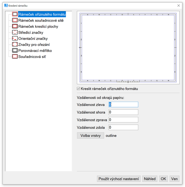 Vytvoří rámeček dokumentu podle nastaveného formátu. Levý dolní roh rámečku je identický se středem souřadnic. Metoda vykreslení rámečku je popsána výše.