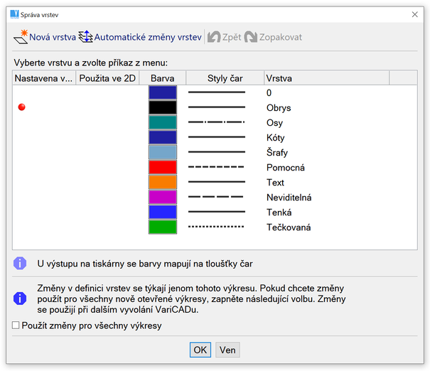 Vytváří novou vrstvu, mění stávající nebo maže vrstvy. Smazat nejde vrstva "0" a vrstvy, které obsahují položky.