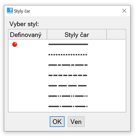 VariCAD používá 7 stylů kreslení 2D čar. Následující dialogové okno obsahuje seznam stylů čar pro kreslení ve 2D.