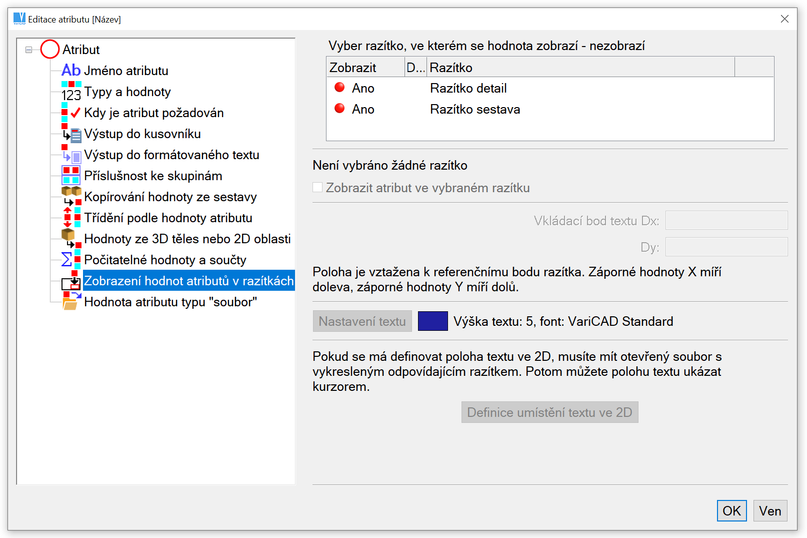Vybrané atributy se mohou zobrazovat v razítku. Jeden atribut se může zobrazovat ve více razítcích. Nastavuje se: