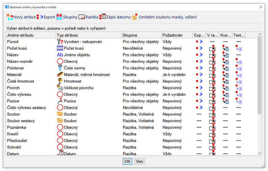 Pomocí této funkce se zadávají nové atributy, odstraňují nebo mění stávající. Vytvářejí se skupiny atributů, nastavuje vyplňování razítek a exporty dat z archivu. Atributy a jejich vlastnosti jsou popsány níže.