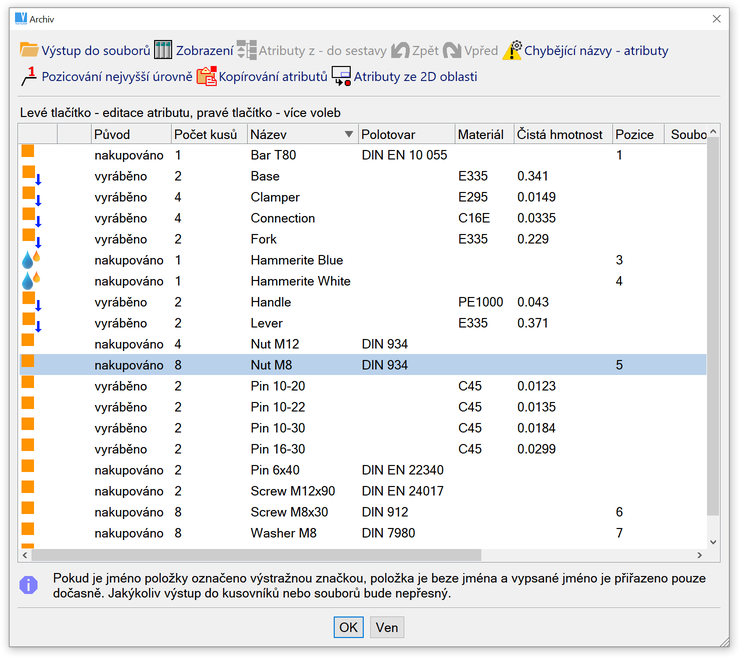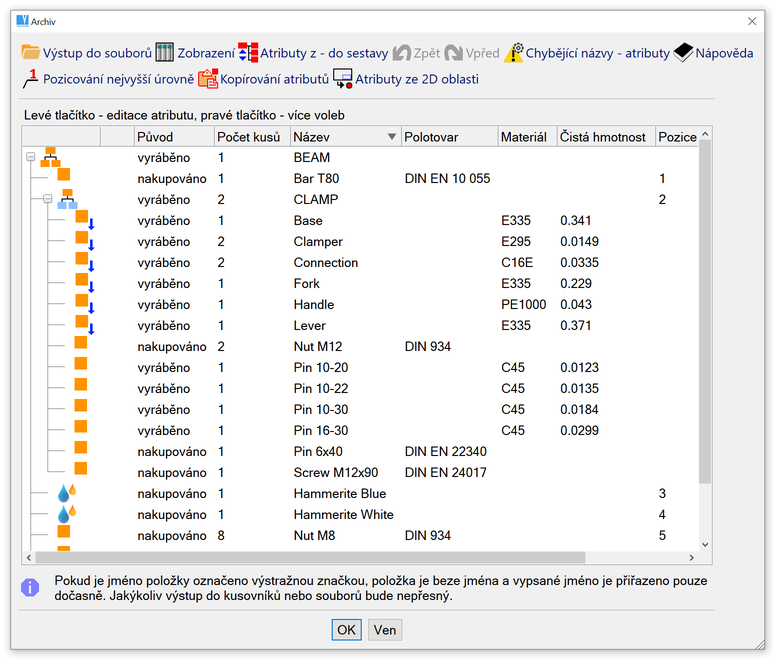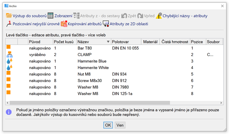 Archiv obsahuje seznam detailů sestavy s jejich jmény a atributy. Archiv umožňuje: