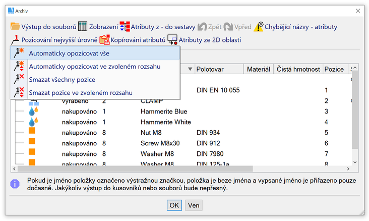 Chcete-li zadávat čísla položek (pozice), musí vaše Archivní maska obsahovat atribut typu "Pozice". Poté můžete přiřadit čísla položkám v sestavě na nejvyšší úrovni. Po vytvoření 2D výkresu se čísla položek automaticky používají jako pozice.