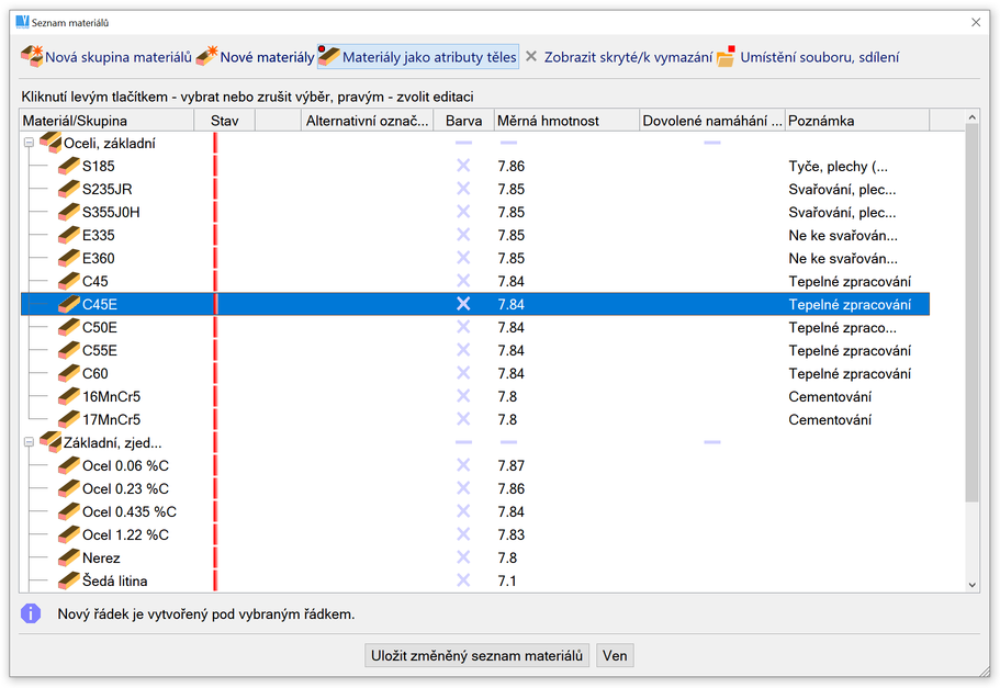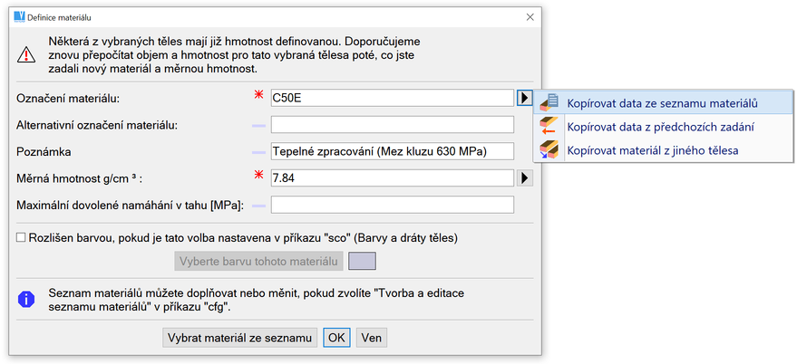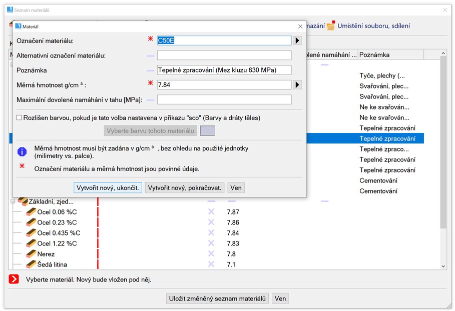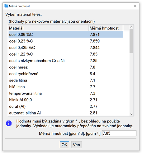 Spolu s označením materiálu se povinně vyplňuje měrná hustota a další nepovinné údaje. Potom je snadné automaticky počítat hmotnost těles.