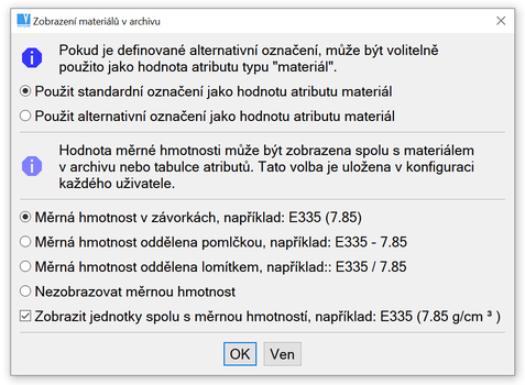 Vždy je nutné definovat označení materiálu a měrnou hustotu.