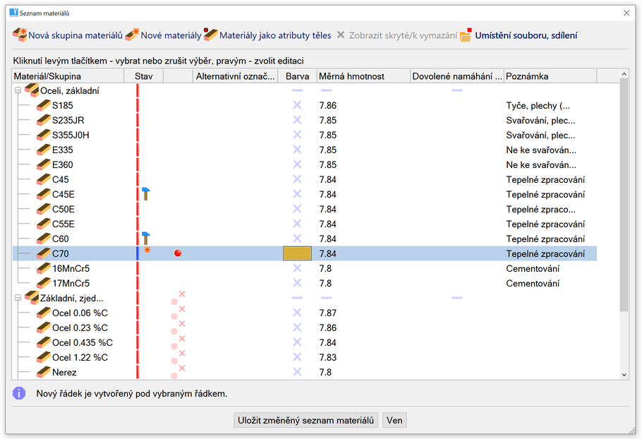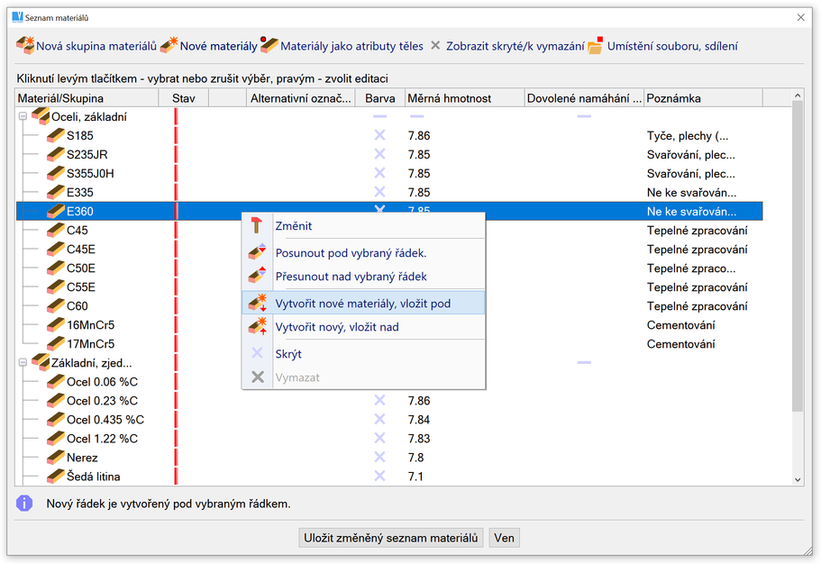 Chcete-li vytvořit nový materiál, klepněte pravým tlačítkem myši na řádek a vyberte, zda je nový materiál vložen nad nebo pod ním. Můžete také kliknout na odpovídající ikonu v horním řádku ikon. Chcete-li vytvořit skupinu materiálů nebo upravit nebo odstranit materiál nebo skupinu, klepněte na řádek a vyberte z menu.