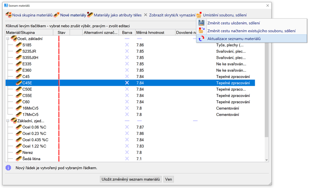 Sdílení seznamu materiálů je k dispozici ve stejné nabídce, protože můžete vybrat možnosti aktualizace (viz výše). Pokud vytvoříte materiálovou tabulku vhodnou pro všechny ostatní uživatele, uložte ji na vybranou síťovou cestu. Všichni uživatelé si musí nastavit stejnou síťovou cestu pro načítání seznamu materiálů.