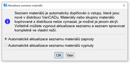 Tento příkaz spravuje seznam materiálů. Můžete jej také spustit ze systémových nastavení - příkaz "CFG", ze základní části "Seznam materiálů". Zde můžete smazat uživatelsky definovaný seznam materiálů. Pokud je uživatelsky definovaný seznam smazán, vytvoří se nový jako kopie seznamu distribuovaného v instalaci VariCADu.