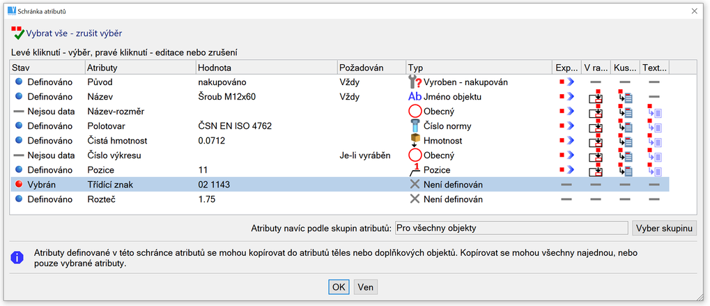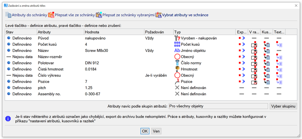 Atributy mohou být vloženy do schránky. Pak tyto atributy lze kopírovat do jiného tělesa. Můžete přepsat všechny existující atributy nebo pouze vybrané ze schránky. Také může některé atributy jako datum vytvoření, autor projektu, zakázka nebo číslo sestavy zadávat hromadně.