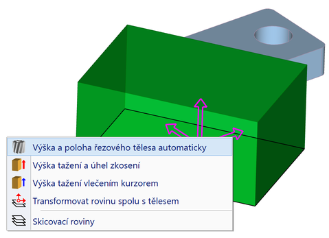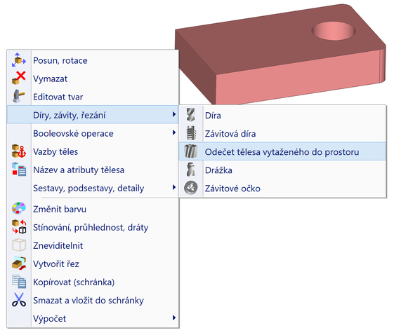 Po kliknutí pravým tlačítkem myši na horní rovinu se objeví menu. Vyberte „Odečet tělesem vytaženým do prostoru".