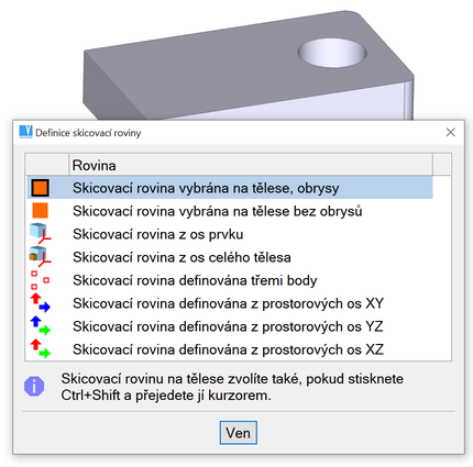 Vyberte rovinu skicování a vytvořte obrys řezného nástroje. Po potvrzení tvaru a umístění obrysu se nástroj vytvoří a automaticky odečte z tělesa.