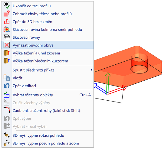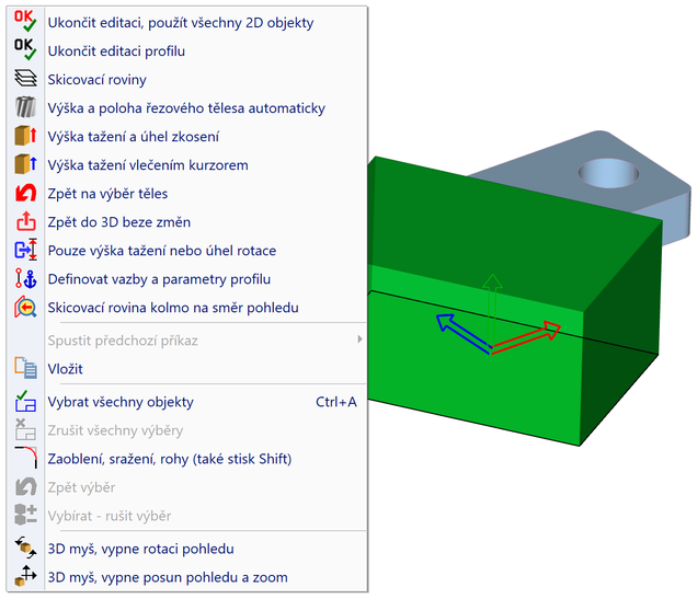 Je-li vybráno těleso, které vzniklo ze 2D profilu (tažením, rotací nebo přechodem profilů), pak jeho změna spočívá v editaci tvořícího profilu (není závislý na původním tvořícím 2D profilu). Při detekci takového tělesa se zobrazí příslušný kurzor a také jeho tvořící profil a původní souřadný systém pro snazší orientaci při změně profilu. Po výběru tělesa ke změně se zobrazí tvořící profil ve 2D kreslící rovině a pomocí 2D funkcí je možné ho změnit ( Výběr 2D profilu ). Ukončení změn 2D profilu je možné pouze tlačítkem OK v plovoucím toolbaru. V tomto toolbaru jsou následující ikony: