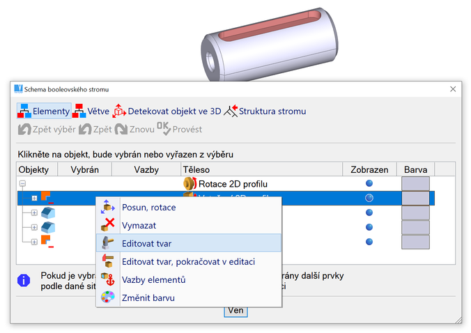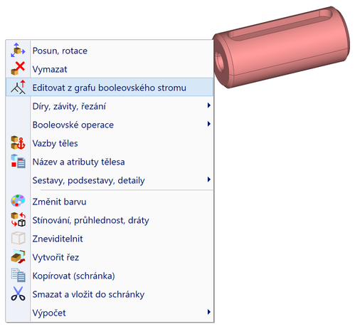 Kliknutí pravým tlačítkem myši na těleso a vybrat Editovat z grafu Booleovského stromu