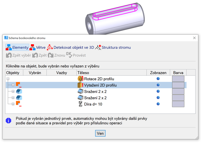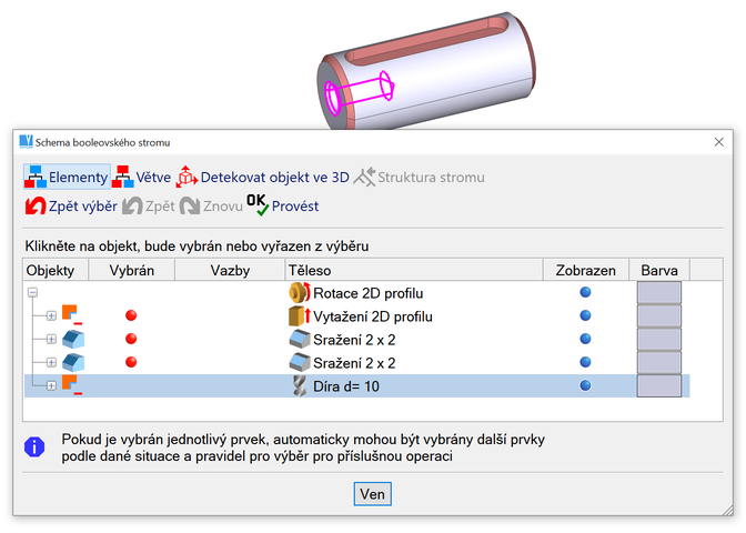 Tato funkce vybírá vždy jen základní tělesa. V případě Booleovského stromu vybírá základní části stromu (hranol, válec, díra,...). Tělesa načtená ze STEPu nelze měnit, tudíž ani vybrat.