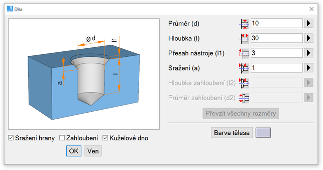 Pokud definujete rozměry díry nebo drážky, změní se obrázky v panelu podle vybrané možnosti. Rovněž můžete definovat kóty pomocí prostorového kótování podobně jako u základních těles - viz Základní objemy.