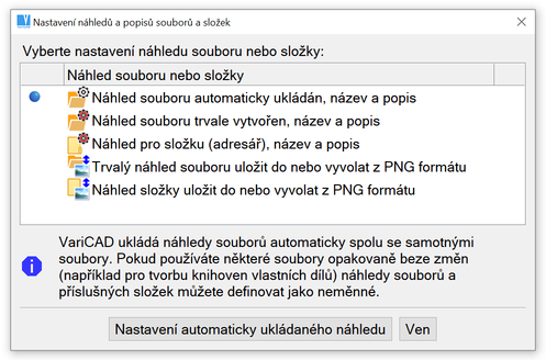 Náhled souboru se automaticky uloží, kdykoli je soubor uložen. Obsah obrázku je součástí 3D souboru. Zde lze definovat, zda je náhled vytvořen z aktuálně používaného úhlu pohledu nebo z předdefinovaného pohledu (jako je pohled zepředu, pohled shora, uživatelsky definovaný pohled ...). Lze také definovat doplňující název souboru a podrobný popis.