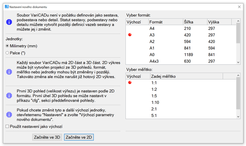 Spuštěním této funkce se vlastnosti právě otevřeného dokumentu nastaví jako implicitní. To znamená, že každý další nově otevřený dokument, bude mít nastavené jednotky, formát, měřítko, předdefinované úhly konstrukčních čar a síť bodů podle implicitního nastavení.