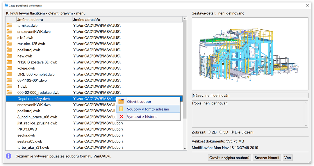 Dialogové okno Historie otevřených souborů, možnosti kliknutí pravým tlačítkem myši