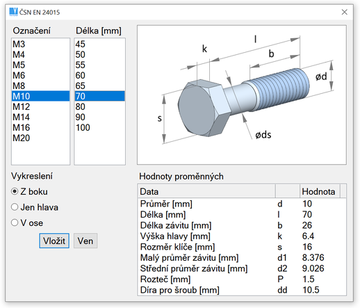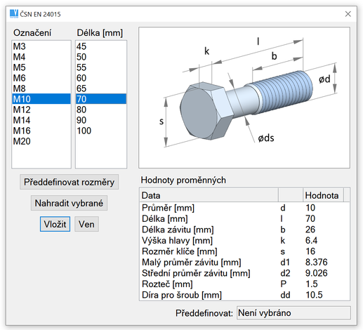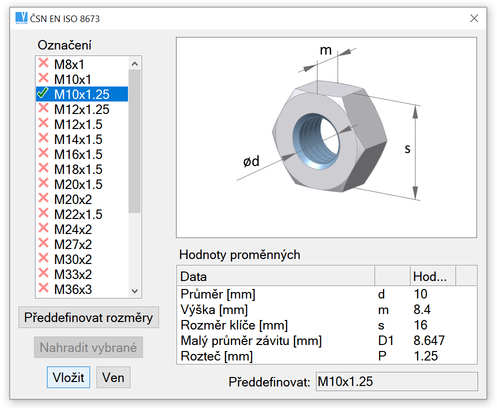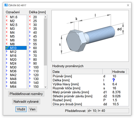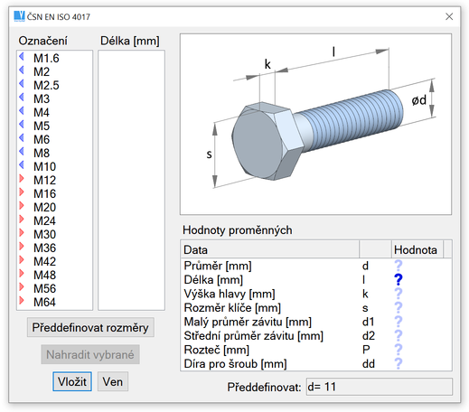 Kromě změny rozměrů můžete také změnit typ vybrané strojní součásti. Rozměry jsou opět předvoleny v dialogovém okně.