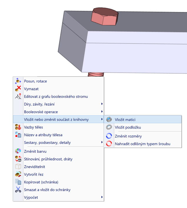 Po kliknutí pravým tlačítkem myši na strojní součást z knihovny (nebo více součástí) se zobrazí nabídka možností. Může se jednat o vložení protikusů, změnu rozměru nebo změnu typu součásti.