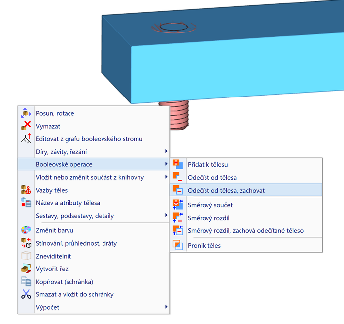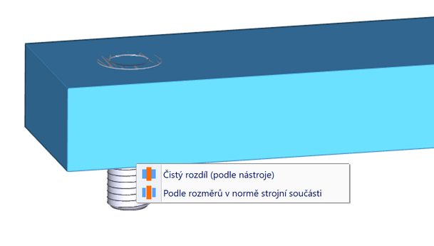 Nabídka s možností vyříznout závit nebo díru pro šroub.