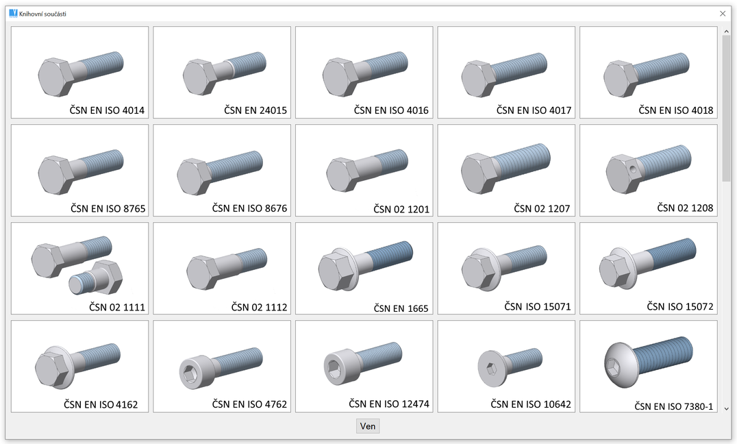 Všechny knihovny strojních součástí jsou dostupné z roletového nebo ikonového menu "Knihovny". Knihovny obsahují: