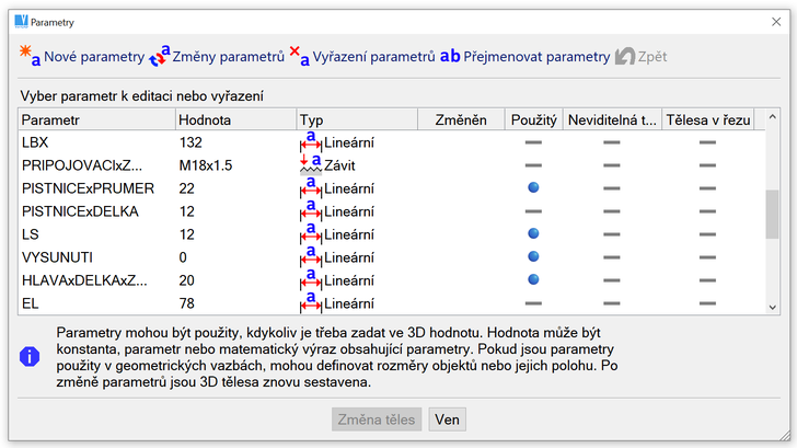 Jednou zadaný parametr se ukládá do tabulky parametrů. Tabulka parametrů je součástí 3D prostoru. Parametry jsou ukládány společně s uložením 3D/2D souboru (dokumentu). Dojde-li k vymazání tělesa s parametry, tabulka parametru zůstane zachována. V případě, že soubor (sestava) obsahuje tělesa (detaily) s parametry, pak každý detail má svou tabulku parametrů. Tělesa, která nejsou zadána jako detail mají tabulku parametrů společnou.