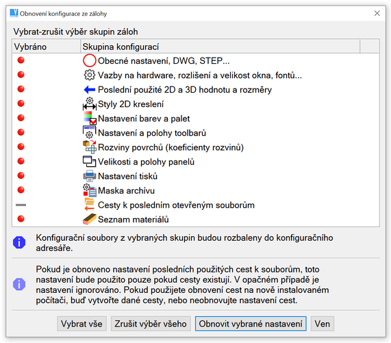 Můžete si vytvořit zálohu všech vašich konfiguračních souborů. Konfigurace je uložena v jednom souboru. Když potřebujete obnovit konfiguraci, můžete zvolit nastavení, které potřebujete obnovit. Typické použití této funkce je zachránit a obnovit pracovní prostředí, pokud budete muset přeinstalovat operační systém nebo pokud migrují do jiné pracovní stanice. Také můžete tuto funkci použít, pokud chcete sdílet některá nastavení s ostatními uživateli (jako 2D kreslení a nastavení stylu kreslení běžně používaných v celé společnosti). Uložení / Obnovení konfigurace je v Roletovém menu Nastavení nebo ho lze spustit z následujících příkazů: