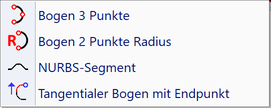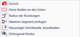 Beim Zeichnen von Polylinien können lineare Segmente hinzugefügt werden. Optional (und voreingestellt) wird jede Ecke abgerundet. Es ist auch möglich, verschiedene Segment-Arten einzufügen. Symbole mit den verschiedenen Optionen sind in der 2D-Werkzeugleiste verfügbar oder im Kontextmenü (Rechts- + Linksklick).