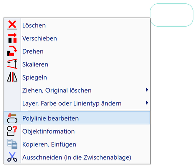 Objekte im 2D können in Polylinien integriert werden, ähnlich wie bei Blöcken. Polylinien verhalten sich bei der Anwahl, wie einzelne Objekte. Anders als bei Blöcken, können nur existierende Linien, Kreisbögen oder NURBS-Kurven integriert werden. Es ist aber auch möglich, neue Polylinien zu erzeugen, anstatt bestehende Elemente zu integrieren.