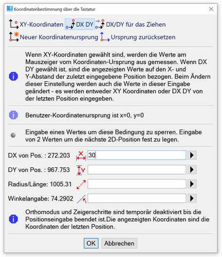 Werden 2 Werte eingegeben, ist die Position exakt definiert. Es ermöglicht daher die Kombination von Eingaben mit festen Koordinaten, Definitionen von Punkten in einem definierten Abstand, unter einem festen Winkel, usw.