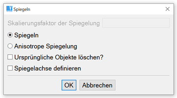 Erzeugt ein Spiegelbild des ausgewählten Objekts. Die Spiegelachse kann durch eine bestehende Linie oder mit zwei Punkten als eine temporäre Linie angegeben werden. Sie können auswählen, ob Sie die ursprünglichen Objekte erhalten oder löschen möchten. Wenn Sie "Anisotrope Spiegelung" auswählen, werden die Objekte auf der gleichen Seite der Spiegelachse erzeugt (im Fall eines positiven Skalierwertes) und rechtwinklig zur Spiegelachse mit dem Skalierungsfaktor vergrößert oder verkleinert. Die "Anisotrope Spiegelung" ist nur in einer Richtung möglich.