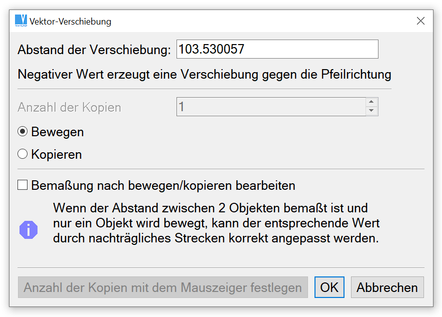 Verschiebt oder kopiert Objekte, indem zuerst ein Bewegungsvektor definiert wird. Dieser Vektor wird durch zwei Punkte bestimmt, die den Abstand und die Richtung angeben. Wenn die Objekte auch kopiert werden sollen, dann können Sie die Anzahl der Kopien angeben und festlegen, ob die ursprünglichen Objekte erhalten bleiben. Mehrfache Kopien werden in einer Reihe ausgeführt. Man kann auch die Länge der Verschiebung ändern, in diesem Fall definiert der Vektor nur die Verschieberichtung.