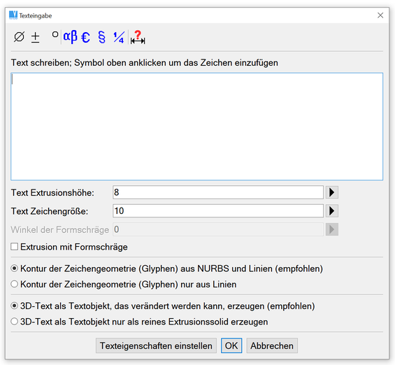 Im Raum extrudierte 3D-Texte können auf die gleiche Weise wie 2D-Texte definiert und geändert werden. Man kann den Text schreiben, die Texthöhe und den Zeichensatz auswählen. Im 3D wird die Extrusionshöhe und die Formschräge definiert. Die Zeichen des Textes wird in 2D-Konturen zerlegt und diese werden dann extrudiert. Optional kann noch festgelegt werden, ob die Konturen in Linien und NURBS-Kurven umgewandelt werden sollen, oder in einzelnen kurze Liniensegmente. Man kann auch eine Anordnung von reinen Extrusions-Solids erzeugen, im Gegensatz zum komplexen 3D-Text Objekt. 3D-Text Objekte können mit gewählten Solids vereinigt oder auch aus denen herausgeschnitten (subtrahiert) werden.