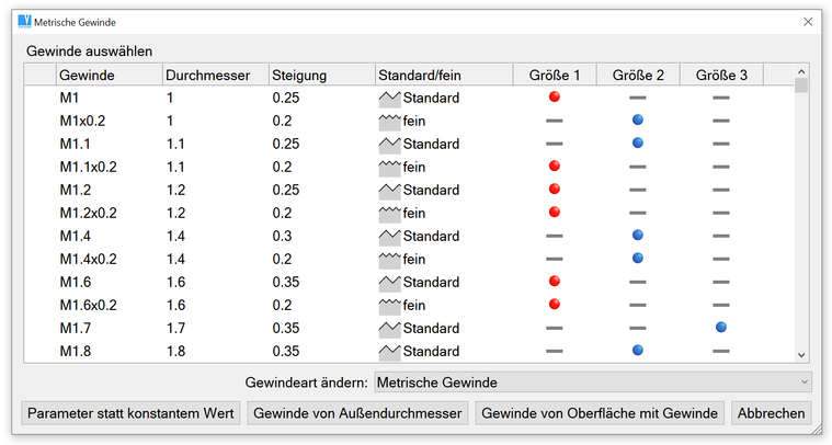 Wenn Sie eine Gewindebohrung oder ein Außengewinde (eine Schraube) erstellen, können Sie das Gewinde aus einer Liste auswählen: