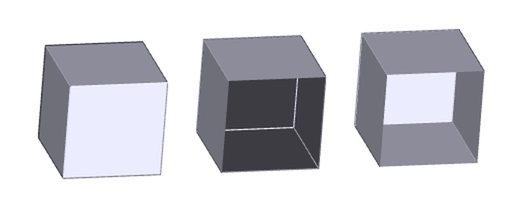 Offene Schalen unterstützen keine Berechnung von Volumen und Trägheitsmomenten und sie unterstützen keine Booleschen Operation und Übergänge (Verrundungen und Fasen). Falls notwendig, können Offenen Schalen in Objekte mit fehlenden Flächen konvertiert werden, auf die dann die Operationen angewendet werden können. Aus einzelnen, mehreren oder allen gewählten Flächen kann eine Schale mit definierter Wandstärke durch Versatz der gewählten Flächen erzeugt werden. Siehe dazu Offset-Flächen - Dicke Schalen.